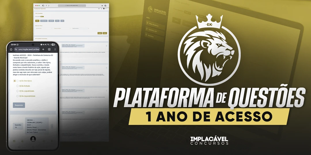 Garanta 12 meses de acesso completo à Plataforma de Questões da Implacável Concurso e estude com profundidade para conquistar sua aprovação em concursos de Guardas Municipais. Com mais de 10 mil questões atualizadas, separadas, organizadas e produzidas conforme os últimos concursos das principais bancas do país, a plataforma oferece uma preparação contínua, estratégica e totalmente alinhada aos editais.
